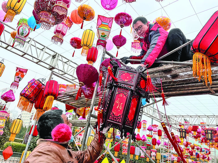 ▲市区南风广场,工作人员忙着布置花灯长廊,让市民早日感受春节氛围。