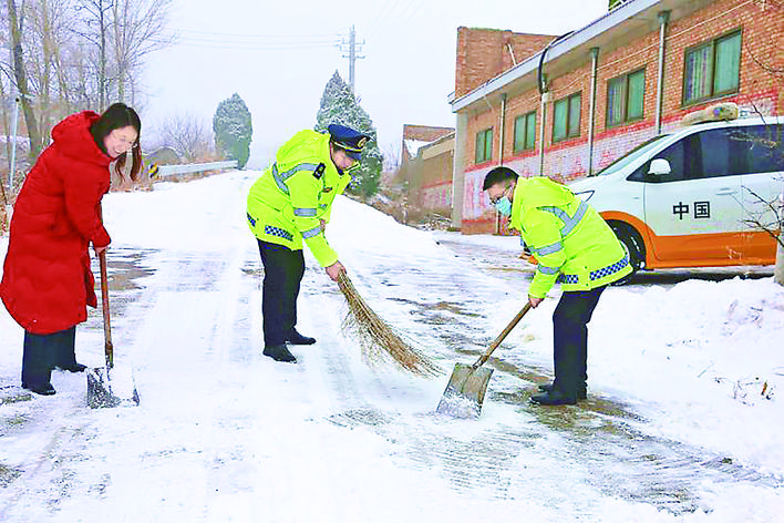 ▲1月24日,在夏县瑶台山景区,该县交通运输综合行政执法队工作人员,与瑶峰镇上焦村疫情防控岗工作人员一起清除路面积雪。 当日,夏县境内迎来2022年第一场雪,中条山上雪雾茫茫。为确保人民群众生命安全,该执法队工作人员不畏严寒,昼夜坚守交通管制卡口,对进山车辆一律劝返,对过往行人进行信息登记、体温测量、查看“三码”,认真细致的工作态度,受到广大群众称赞。