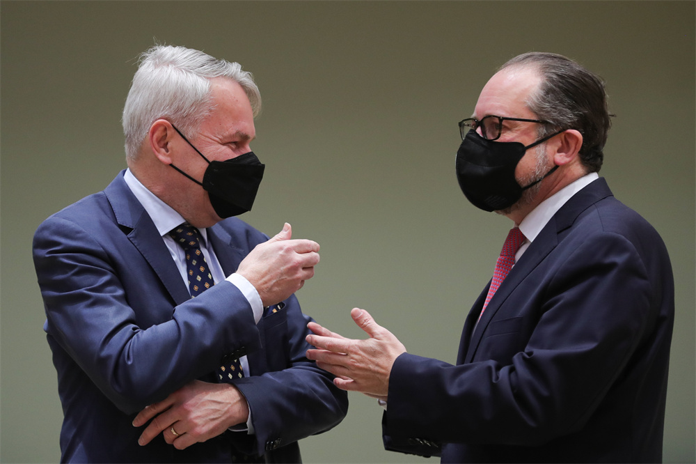 1月24日,在比利时布鲁塞尔的欧盟总部,芬兰外交部长佩卡·哈维斯托(左)在欧盟外长会开始前与奥地利欧洲和国际事务部长沙伦贝格交谈。欧盟成员国外长当天在布鲁塞尔举行会议。 新华社记者 郑焕松 摄