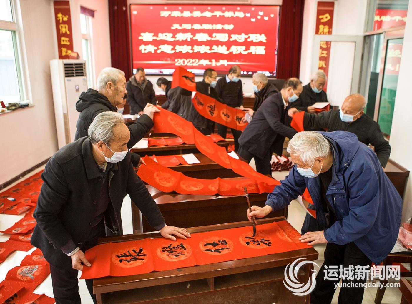 1月24日,参加万荣县委老干部局义写春联活动的退休干部党员在红纸上挥毫泼墨。在新年即将到来之际,该县离退休干部党总支的柴文峰、解振声、屈栋材等擅长书法的6位退休干部汇聚县委老干部局,三天时间义写春联1000多副,为春节期间忙碌在防疫、生产及生活服务一线的各界人士和离退休干部送去虎年的美好祝福。 李克荣 摄