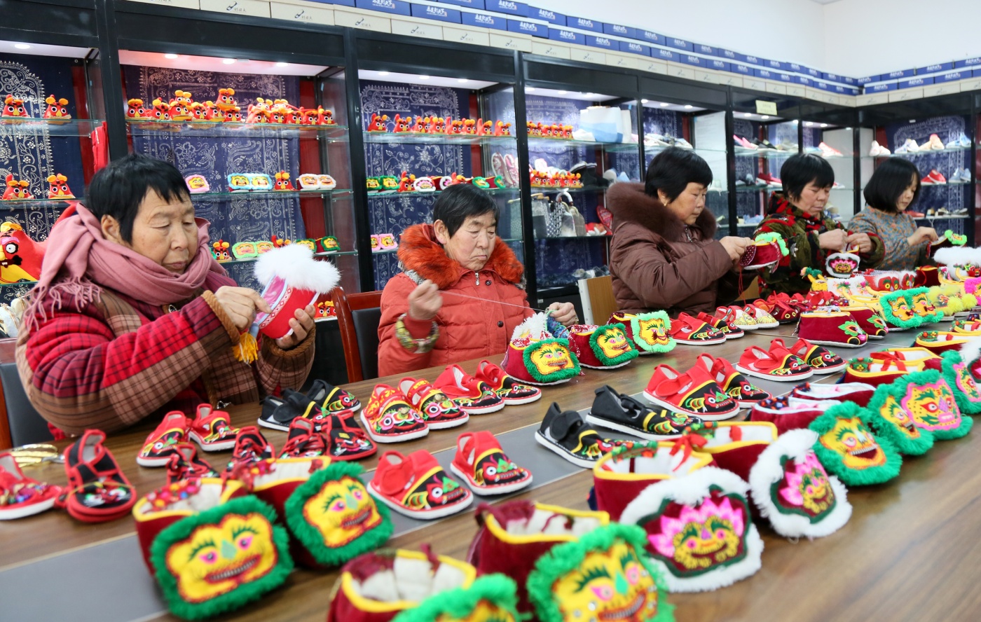 虎年将至,高庄村的村民制作款式各异、憨态可掬的虎头鞋,供应各地市场。 新华社发(康红军 摄)