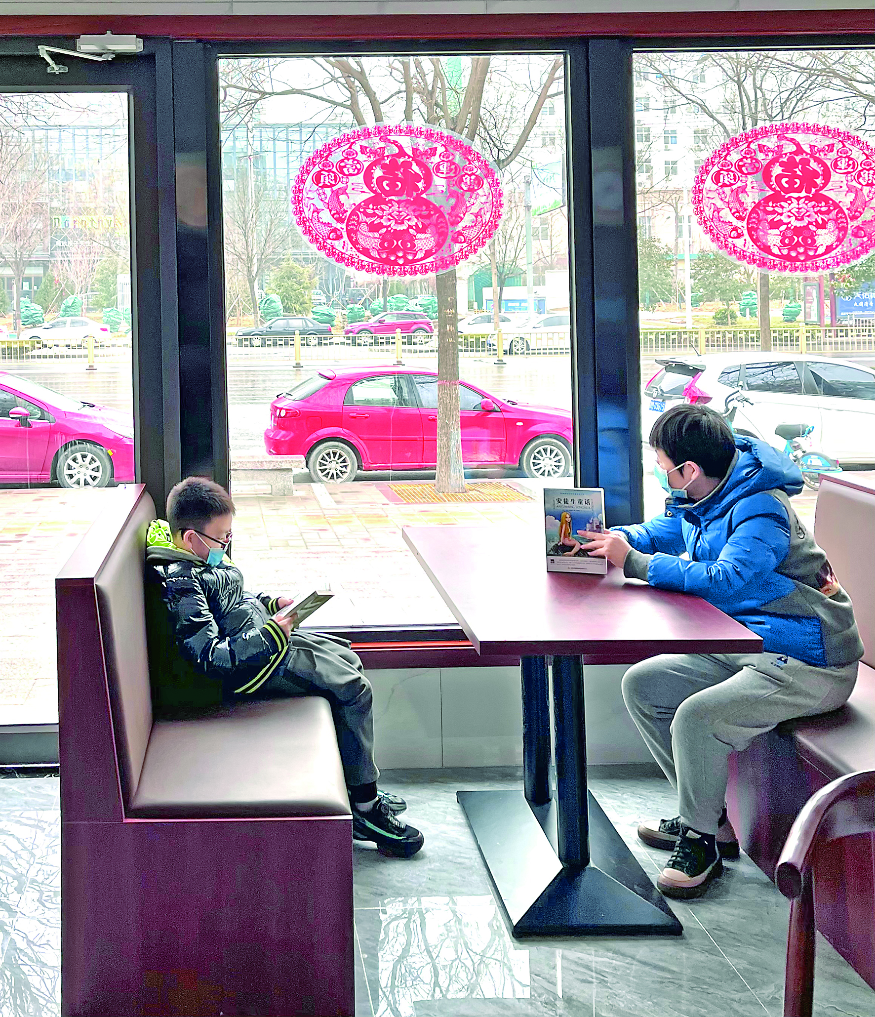 ▲在红旗街的河东驿站里,一名小学生在家长的陪同下阅读