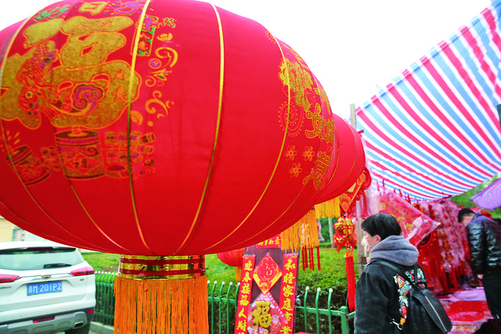 ▲1月29日下午,永济市康乐路年货市场,市民在挑选灯笼、中国结、福字等,迎接新春佳节。特约摄影 薛启涛