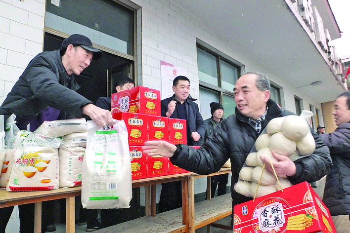 ▲1月28日,新绛县阳王镇苏阳村,村民喜领该村爱心村民吴民学为老人们捐赠的“孝心”年货。特约摄影 高新生