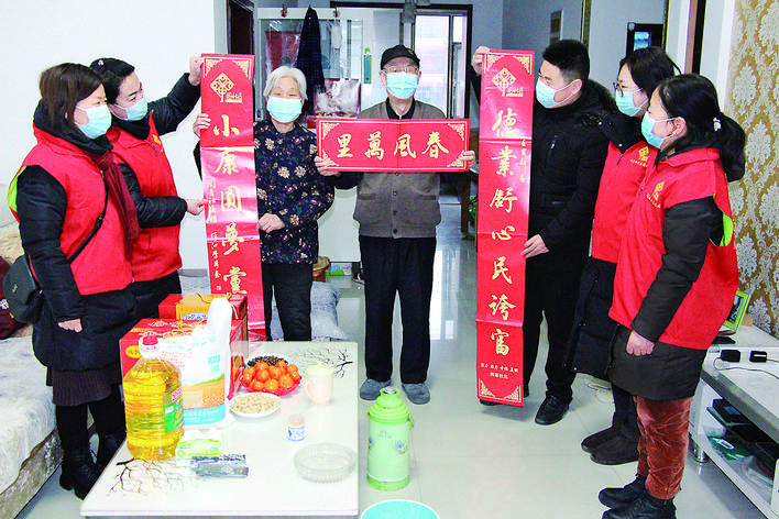 ▲1月29日,闻喜县龙海社区工作人员慰问辖区龙海苑小区八旬空巢老人梁皋、宋温兰夫妇。杨必娇 摄