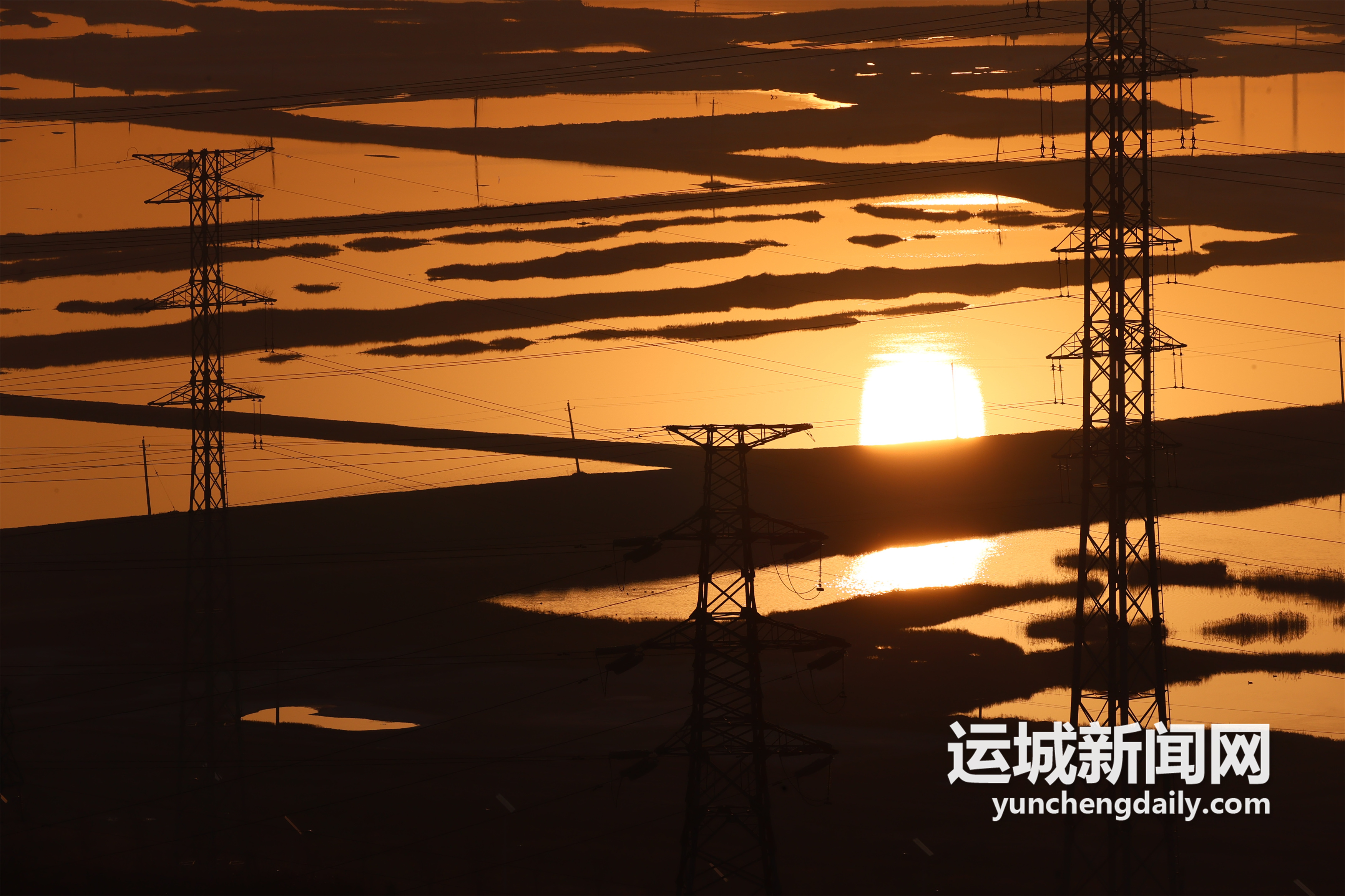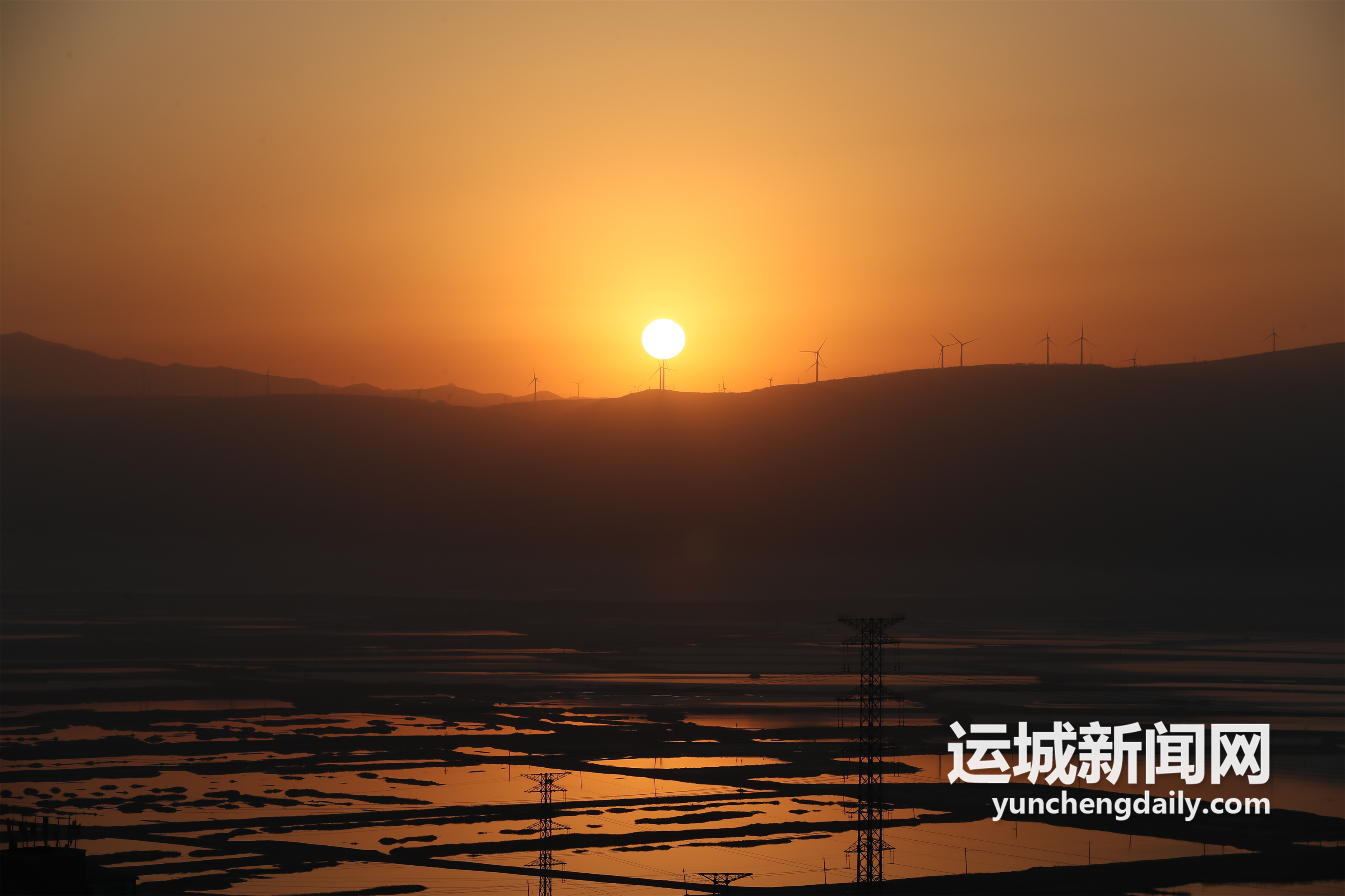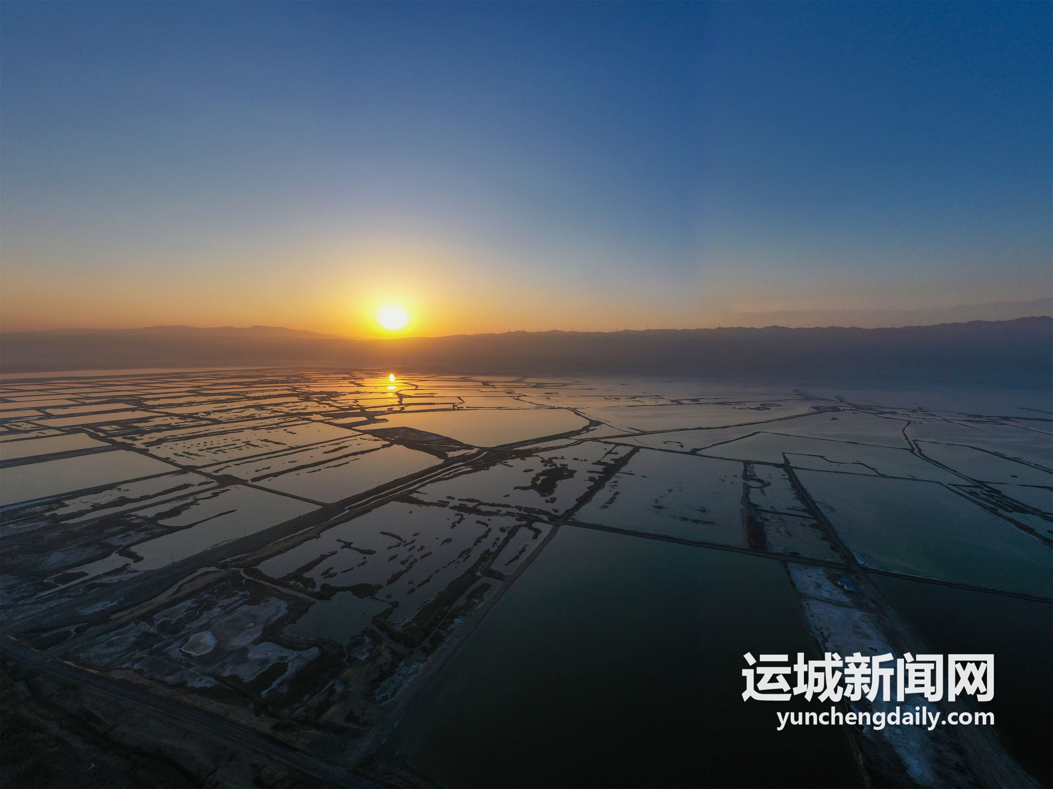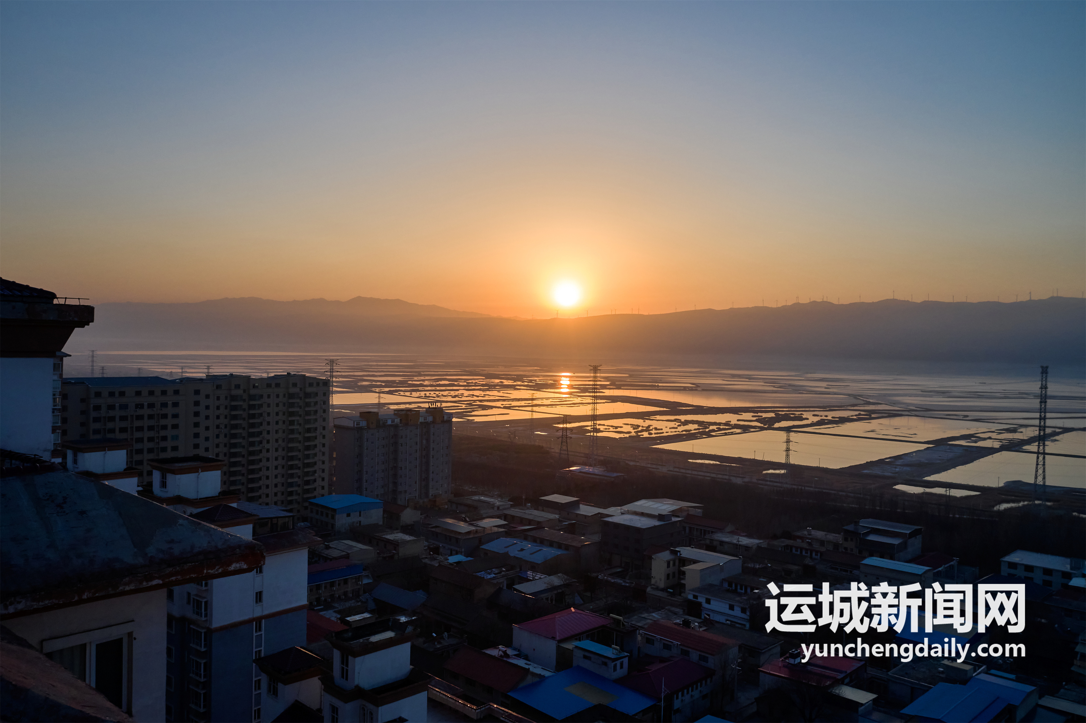 2022年2月1日,大年初一,初升的朝阳映衬盐湖、中条山景观,构成一幅新年旭日东升美景图。记者 闫鑫 摄