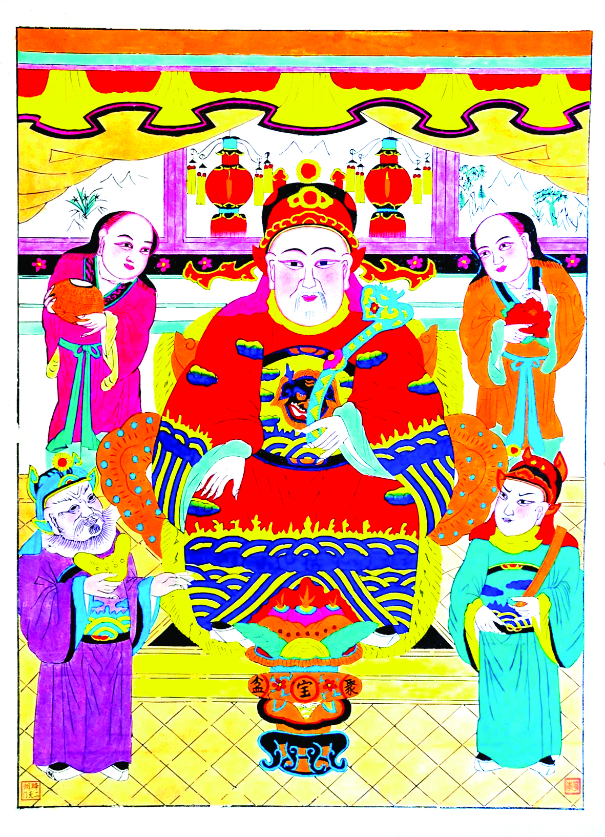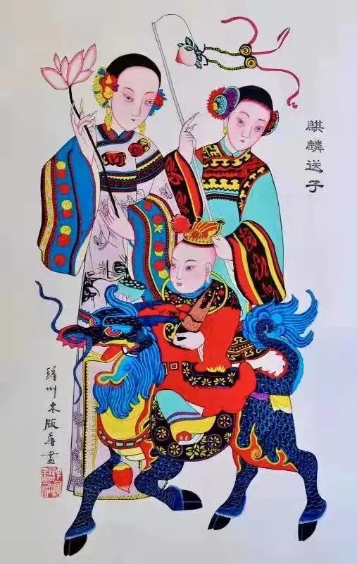 答:能够收集到这么多木版年画的原版和原作,的确是付出了很多。我们在收藏的同时也跟随老艺人学会了木版雕刻、印制、上色等传统技艺。为保证“二天门木版年画”的品质,我们对选料、雕刻、上色都非常讲究。原料刨平、木版雕刻、细节打磨、年画套色印制、描边上色……一幅年画的制作,至少需要七八道精细工序。最简单的彩色年画,在印制时也需要进行3次上色,全过程需要耗费超过半个月时间。我夫人李华对绛州木版年画的历史脉络、工艺流程、绛地年画的艺术特色等都有研究,她的手绘创制作品荣获多个全国奖项。其中,《福禄寿》在第十五届中国工艺美术大师作品暨国际艺术精品博览会上获得2014“百花杯”中国工艺美术精品奖银奖;《袖珍人物》获得联合国优秀手工艺品徽章;《闺房教子》和《麒麟送子》在第三届全国(潍坊)木版年画联展中荣获金奖;《福禄寿》以全国之最在全国(开封)第二届木版年画艺术节中获最佳创新奖;《麒麟送子》和《财神》获全国(开封)第二届木版年画艺术节优秀传承奖;《义勇武安王》在第十六届中国工艺美术大师作品暨国际艺术精品博览会上获得优秀奖;《麒麟送子》作为绛州木版年画代表作品,被选登2017年《中国年画》挂历,面向全球发行。