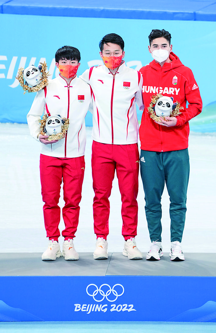 ▲2月7日,冠军中国选手任子威(中)、亚军李文龙(左)与季军刘少昂在颁发礼品仪式上。 新华社记者 王毓国 摄