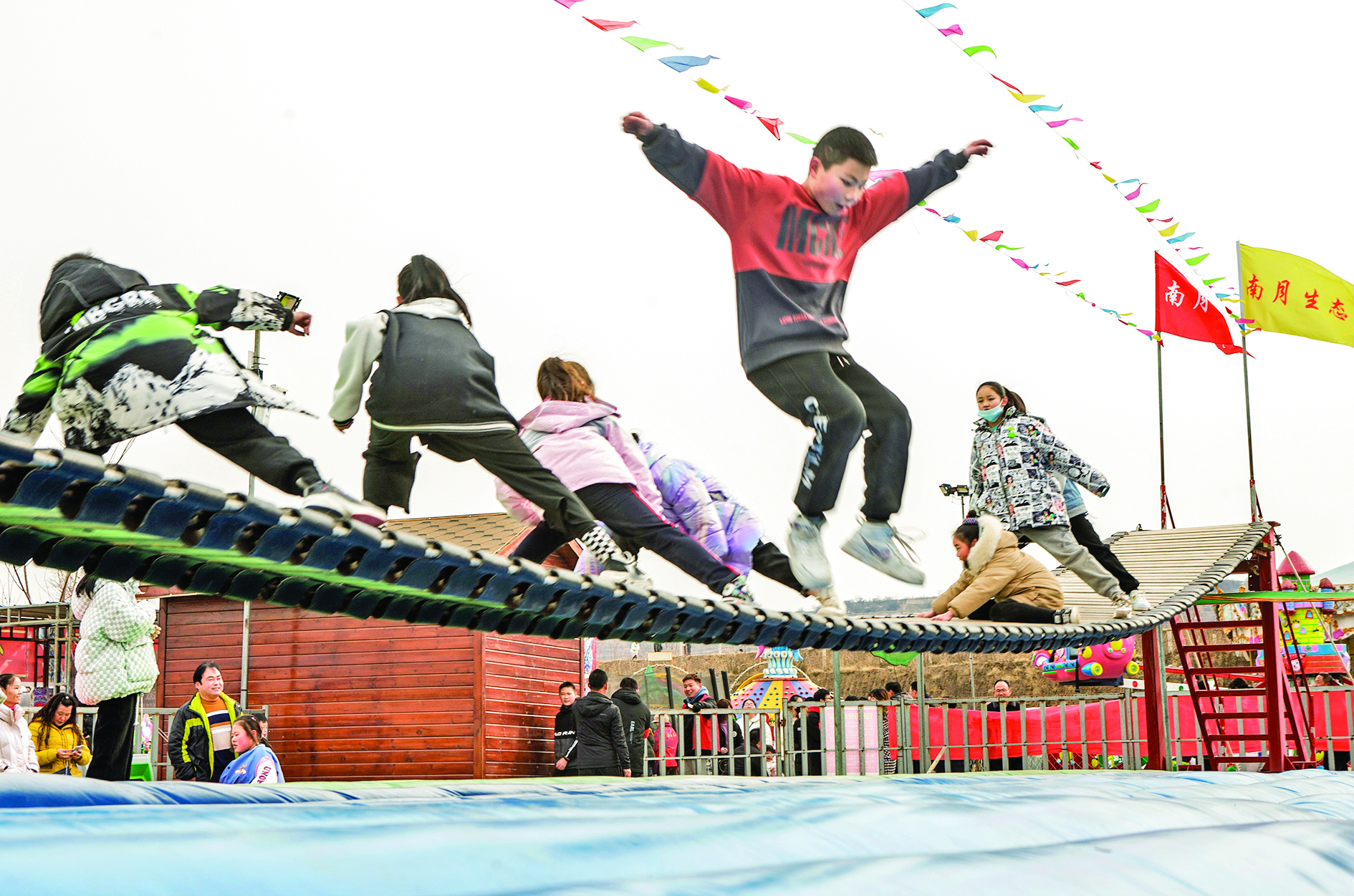为活跃春节期间群众的文化生活,该县在做好疫情防控的同时,在各旅游景区和公园引进网红桥、五色彩牛巡游等多种新颖有趣的文体活动项目,让群众在运动和笑声中欢度新春。(特约摄影 李克荣)