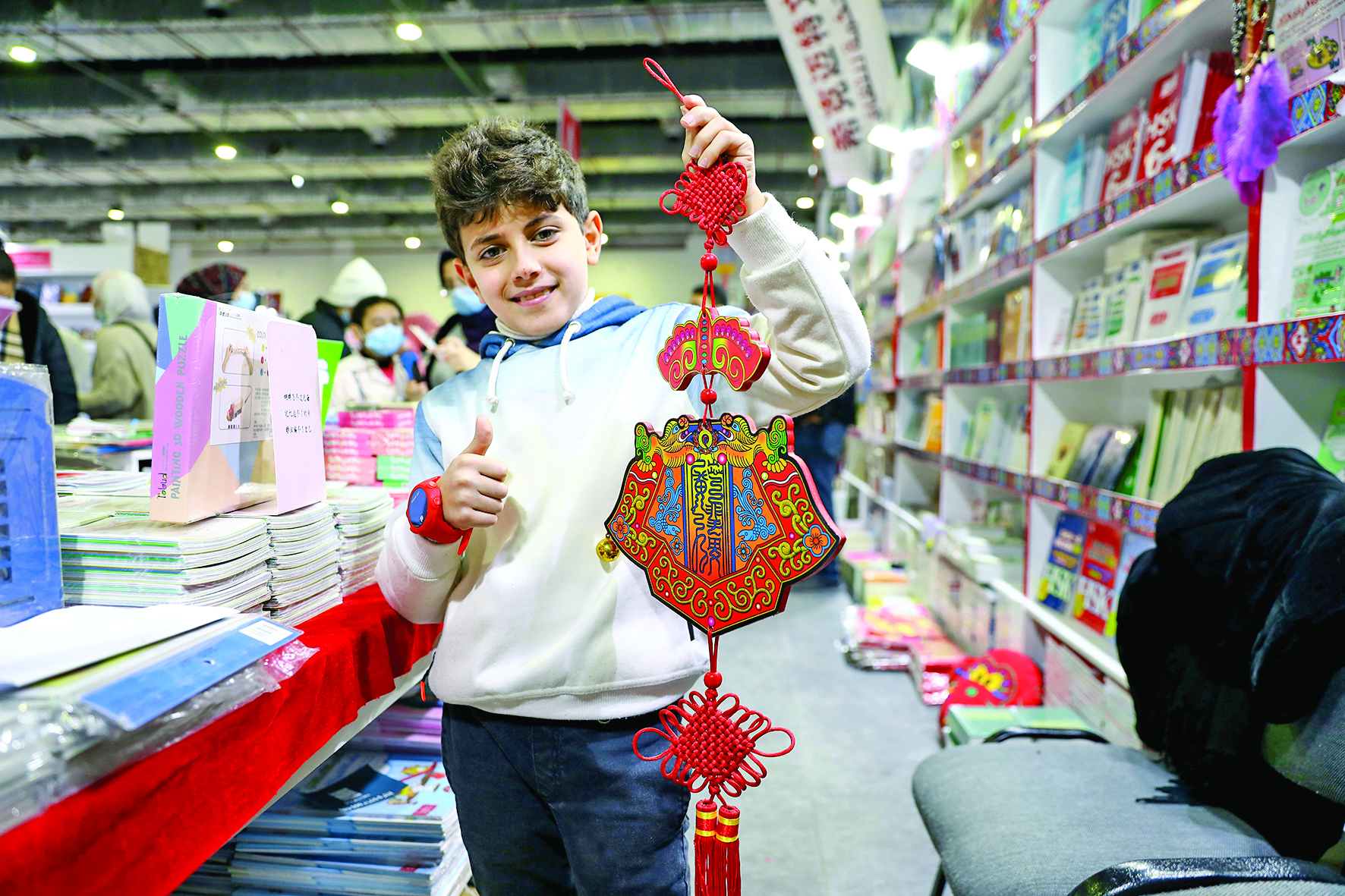 ▲2月4日,在埃及开罗举办的第53届开罗国际书展上,一名男孩在中国图书展位展示春节装饰。当日,百余本由中文翻译成阿拉伯语的中国图书受到众多外国读者青睐。恰逢中国农历春节期间,开罗国际会展中心设立的4个中国图书展位张贴了中国福字和对联,亮眼的“中国红”给书展带来了浓浓的中国年味。