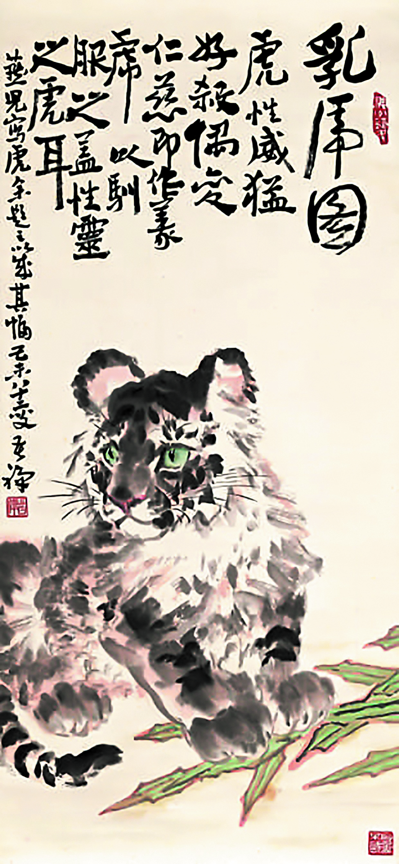身为画者,我虽无“屠龙之术”,却有“画虎之技”,理当应时助兴。画几只小虎,题“虎虎生机”“憨态可掬”“今日似小咪,来日傲山林”;画一只大虎几只小虎,赞美母爱子、子孝母,家庭和谐美满;画一幅小虎喂兔子月饼的漫画,题为“卯食寅粮”,借用成语“寅食卯粮”,反其意而用之,以祝岁岁有余粮!我还曾作一大虎,题拙诗一首:“梦生斗胆挥椽笔,忽而化做伏虎尊。文炳玄黄昭河岳,虎步乾坤泣鬼神。跨下雄风飞日月,眸前冷辉射星辰。命尔今夕栖吾画,明岁伴我跃千寻!”(《北京晚报》)