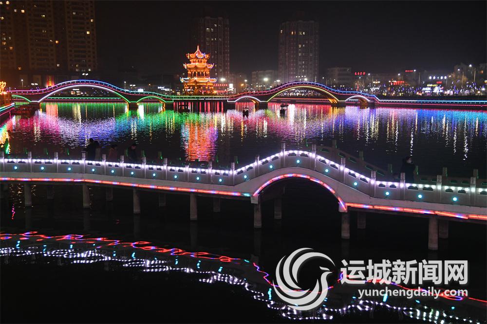 春节期间,闻喜县各公园、广场及大街小巷,各式各样的景观灯营造出浓浓的节日氛围。图为闻喜西湖公园夜景一角,梦幻的流星雨光影倒映在湖面上,美不胜收。