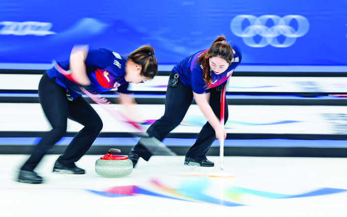 2月13日,韩国队选手金善英(左)和金荣美在比赛中。 当日,在北京国家游泳中心“冰立方”举行的2022年北京冬奥会冰壶女子循环赛比赛中,中国队对阵韩国队。 新华社记者 王婧嫱 摄