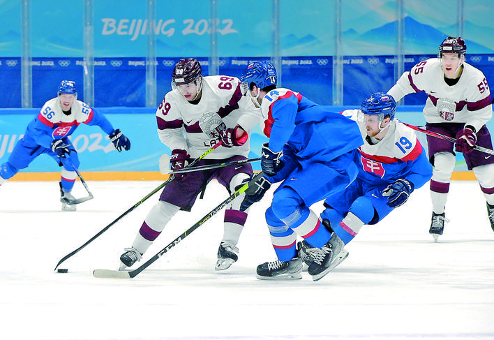 2月13日,拉脱维亚队球员尼古拉伊斯·叶利塞耶夫斯(左二)在比赛中拼抢。 当日,在国家体育馆举行的北京2022年冬奥会男子冰球小组赛中,斯洛伐克队以5比2战胜拉脱维亚队。 新华社记者 李 安 摄