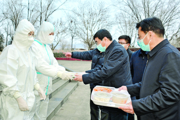 1月31日,河津市委副书记、市长何伟看望慰问春节期间坚守在疫情防控一线的工作人员,并为他们送上热腾腾的饺子。