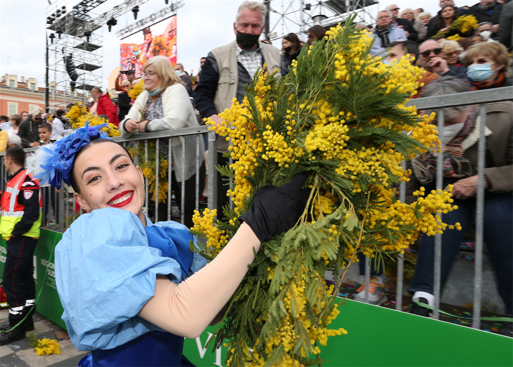 2月13日,在法国尼斯狂欢节“鲜花大战”活动中,表演者向观众发放鲜花。第137届尼斯狂欢节于2月11日至27日举行。在狂欢节“鲜花大战”活动中,游行彩车被鲜花装饰,花车上的表演者将鲜花抛向观众,场面十分壮观。