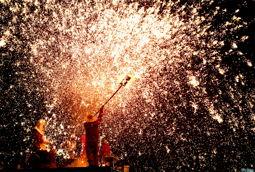 2月14日,在河南省洛阳市洛龙区隋唐城遗址植物园,民俗艺人为市民、游客表演“打铁花”,喜迎元宵佳节。