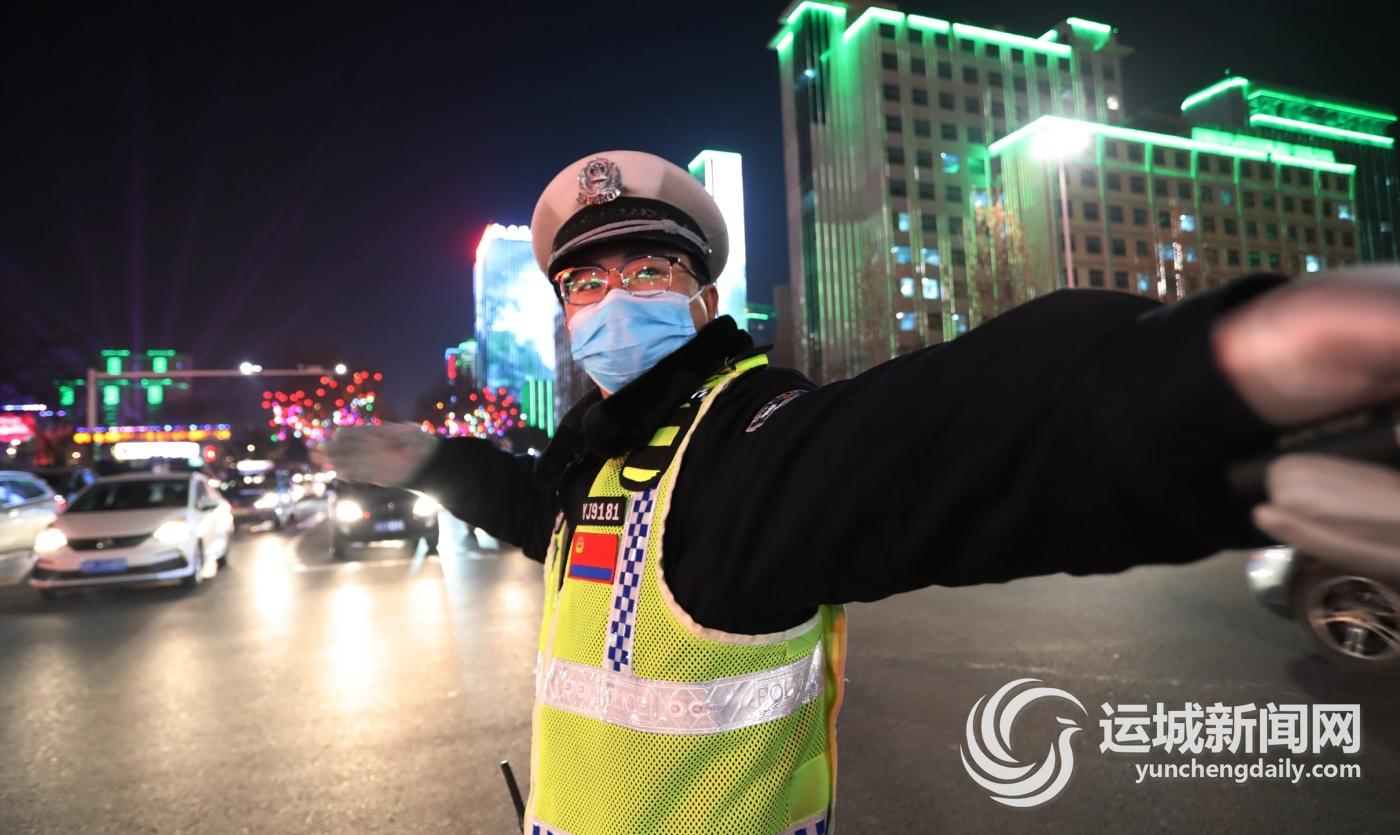 2月15日晚,盐湖交警大队四中队民警在车流中指挥交通。