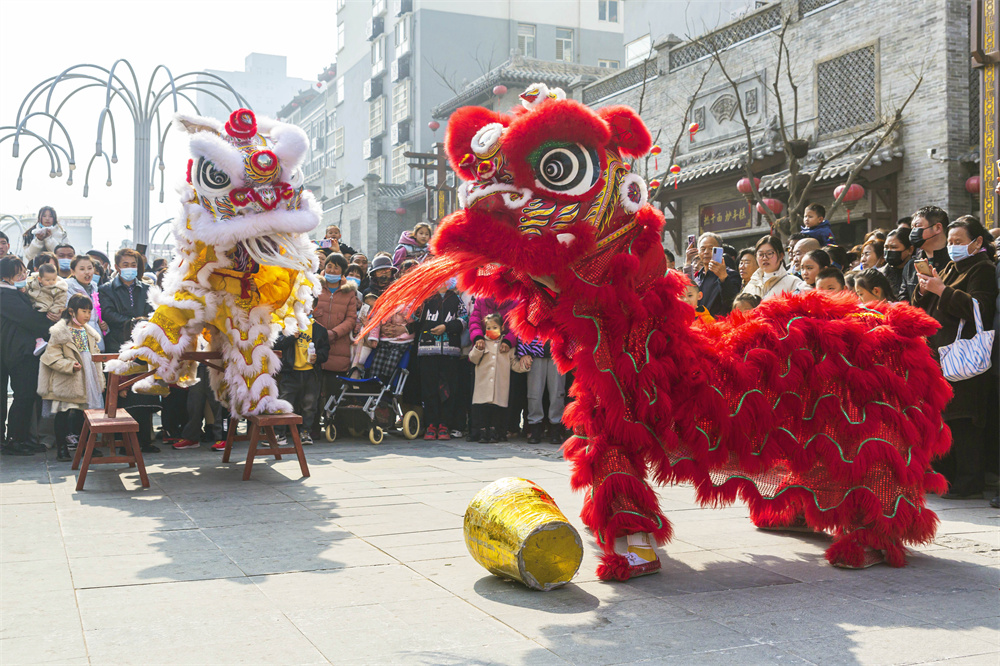 ▲2月15日,市民在盬街景区观看“金狮闹元宵”表演。特约摄影 姜 桦 摄