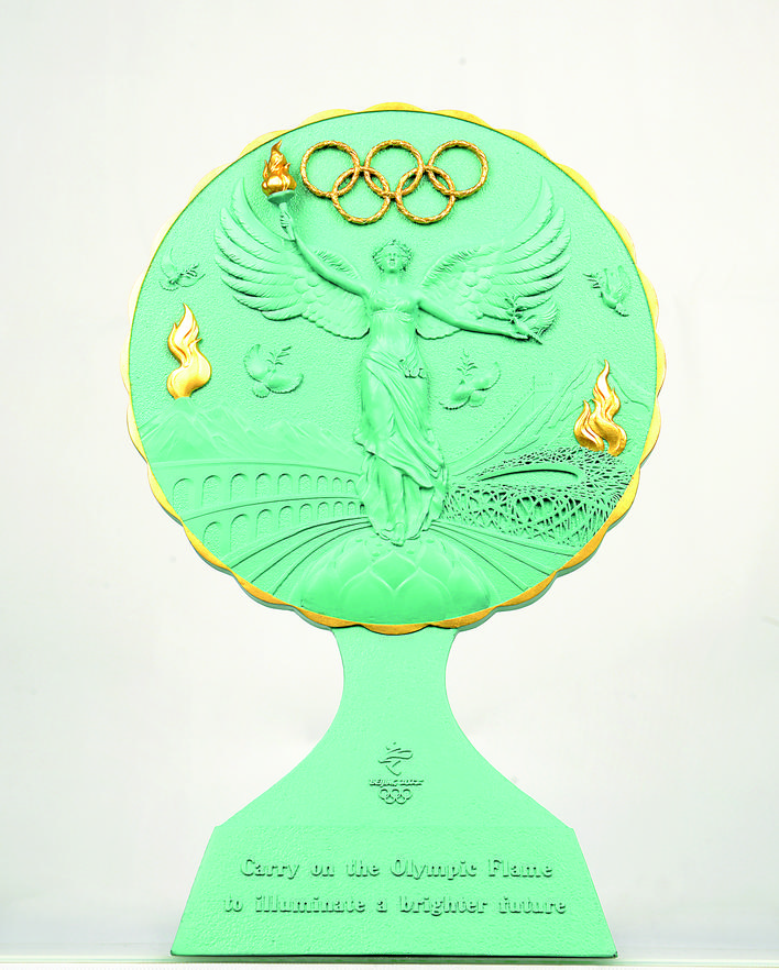 《同心圆梦》,表达了中希友谊和冬奥会文化,以浮雕的表现形式塑造了高举圣火的“奥运女神”,并分别连接:奥林匹亚圣山与八达岭长城和小海坨山,古希腊竞技场与鸟巢体育场,奥林匹亚圣火与象征“双奥之城”的两组鸟巢圣火遥相呼应,三条连接古老的希腊文明和中华文明的友谊赛道,寓意中希两国人民将共举奥运和平圣火,将奥运精神发扬光大,展现出一幅“奥运丝路连中希,奥运精神传古今,奥运圣火燃全球,奥运女神佑人类”的宏伟画卷。雕塑背面中央为北京冬奥会标志,周围环绕24个冬奥体育图标,外围橄榄枝与冬奥主题口号“一起向未来”组成美丽的桂冠,寓意五洲健儿欢聚冬奥会,奋力拼搏,更创佳绩。作品精到诠释了冬奥会文化。
