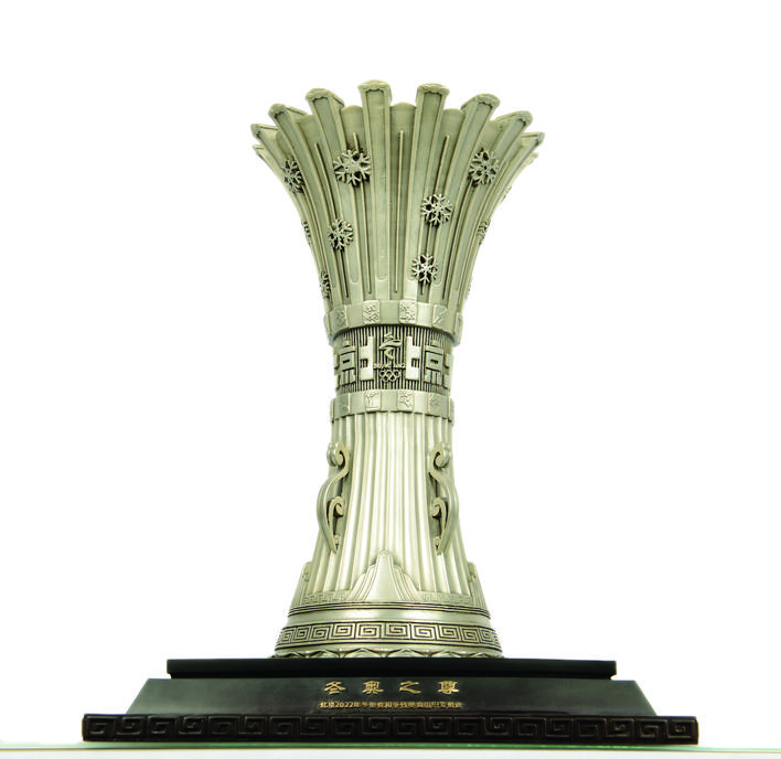 《冬奥之尊》(上图)在古青铜礼器“觚”的基础上融入现代奥林匹克元素设计而成。“觚”同“弧”,独立不群之意,寓意2022年北京冬奥会将是与众不同、独一无二的精彩的奥运盛典。尊身造型自下而上呈弧度收敛,撇口、细腰、长足,线条流畅优美,庄重典雅,坐落在黑色大理石方襟之上,取“天圆地方”之意,寓意中华民族周正圆润的精神,开放博大、拥抱世界、和平立世的胸襟;也寓意着北京冬奥会圆满申办、圆满运作、圆满成功,同时还寓意着全球各国和地区平等参与、圆桌式国际交往,预示着第24届冬奥会公平、公正、公开的原则。尊身总高56厘米,代表中国56个民族大家庭热烈庆祝第24届冬奥会在我国隆重举办。