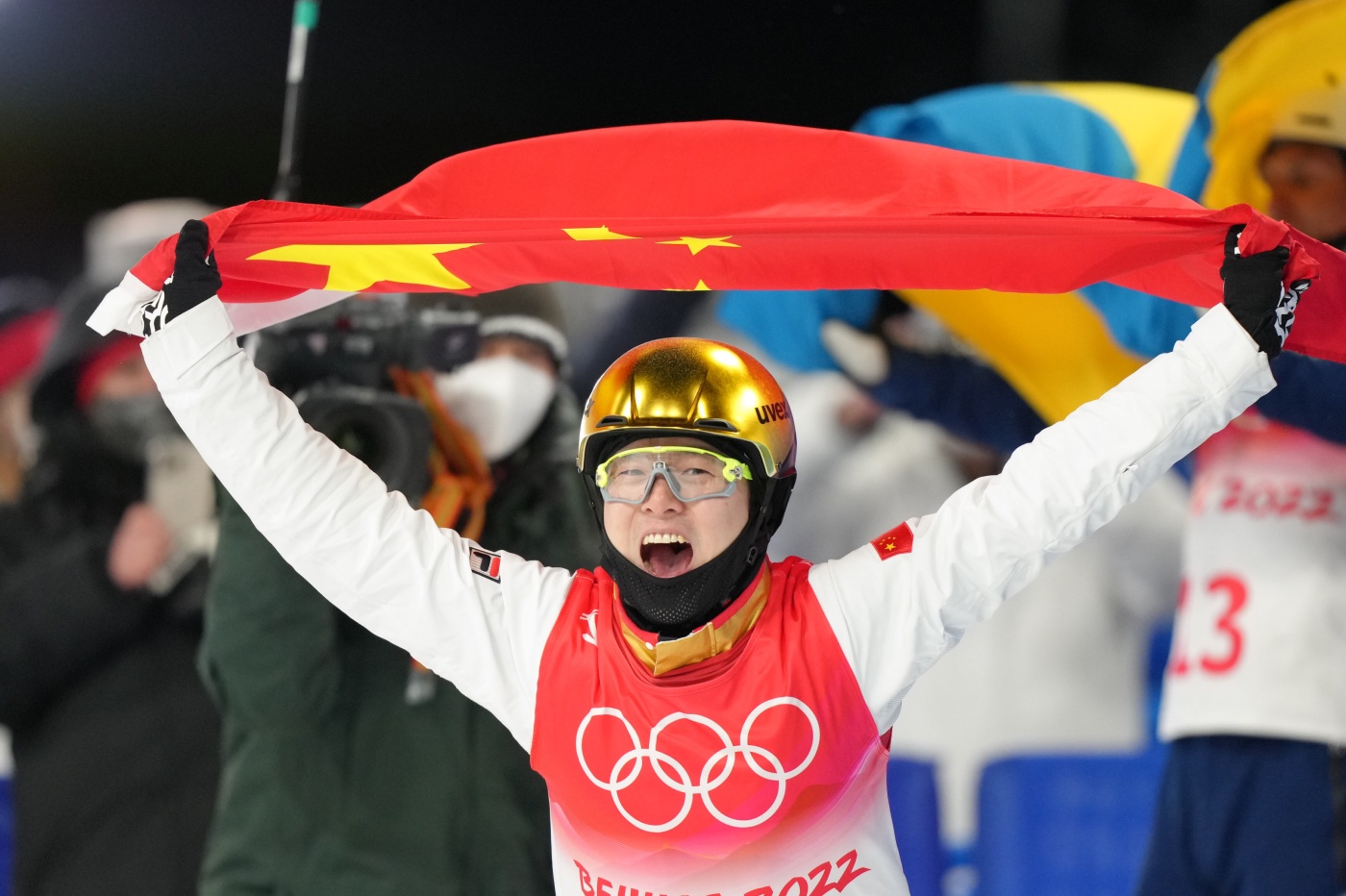 2月16日,中国选手齐广璞比赛后庆祝。 当日,北京2022年冬奥会自由式滑雪男子空中技巧决赛在张家口赛区举行,中国选手齐广璞获得冠军。