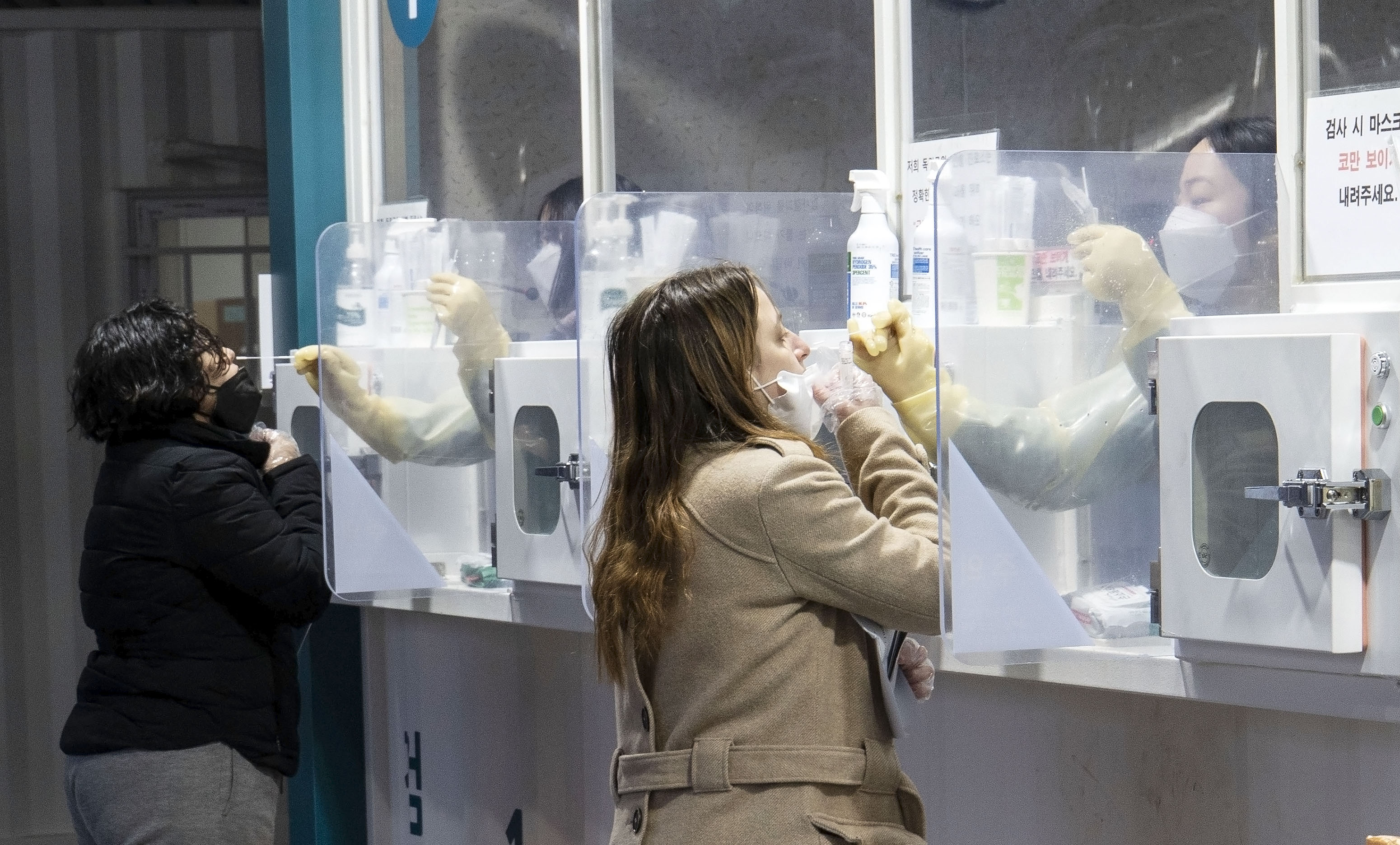 2月16日,医护人员在韩国首尔一处新冠病毒检测点为检测者采样。韩国中央防疫对策本部16日通报,韩国前一日新增新冠确诊病例90443例,累计确诊超155万例,新增死亡病例39例,累计死亡7202例。