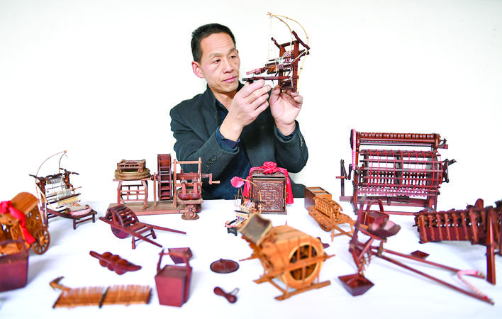 ▲2月11日,稷山县清河镇吴壁村村民苏正盛展示自己精心制作的微缩农具。