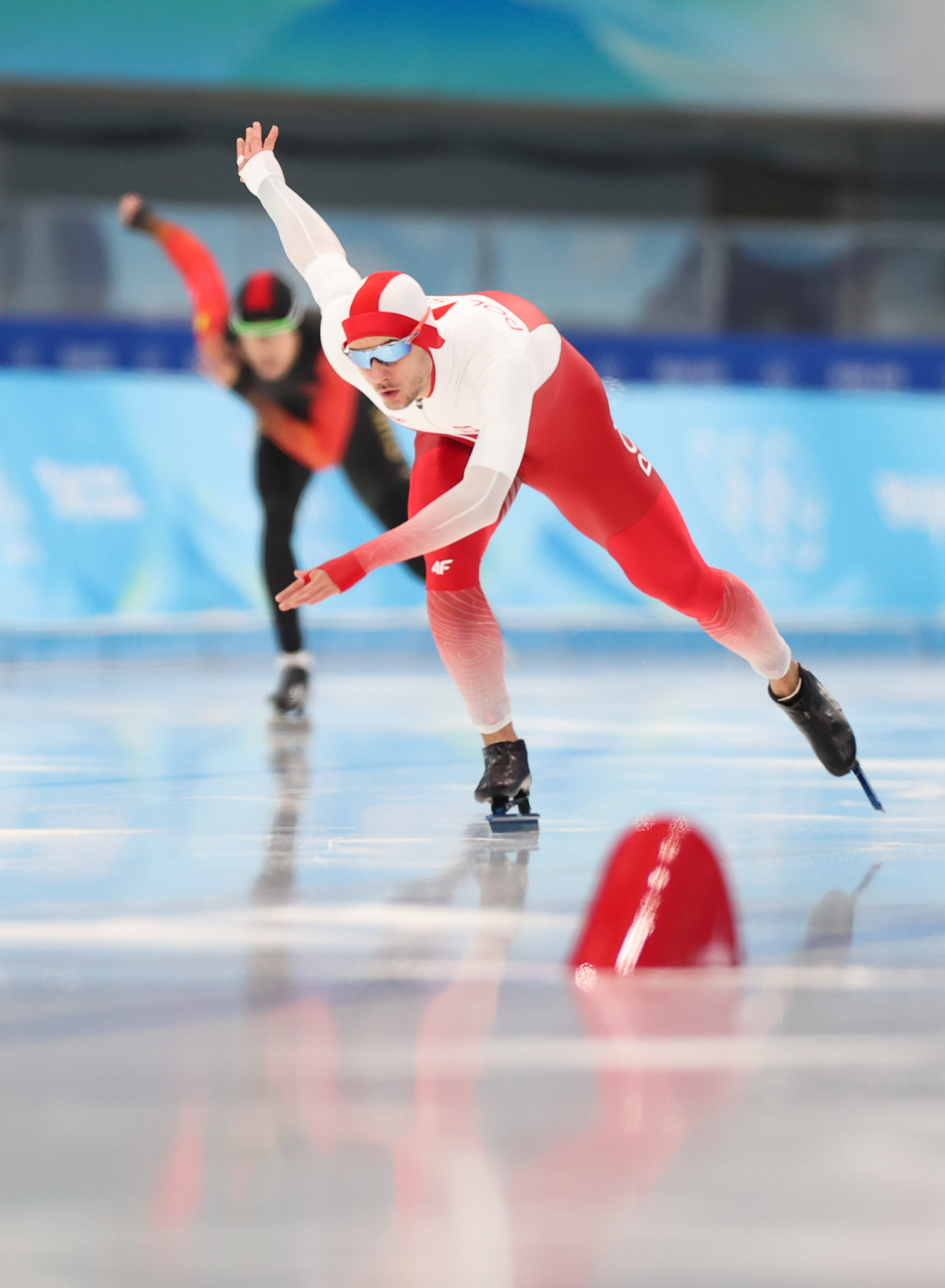 2月18日,波兰选手彼得·米哈尔斯基(前)在比赛中。 当日,北京2022年冬奥会速度滑冰男子1000米决赛在国家速滑馆“冰丝带”举行。 新华社记者 丁 旭 摄