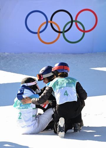 2月8日,中国队选手谷爱凌(右)和瑞士队选手玛蒂尔德·格雷莫德(中)在比赛后安慰法国队选手苔丝·勒德。