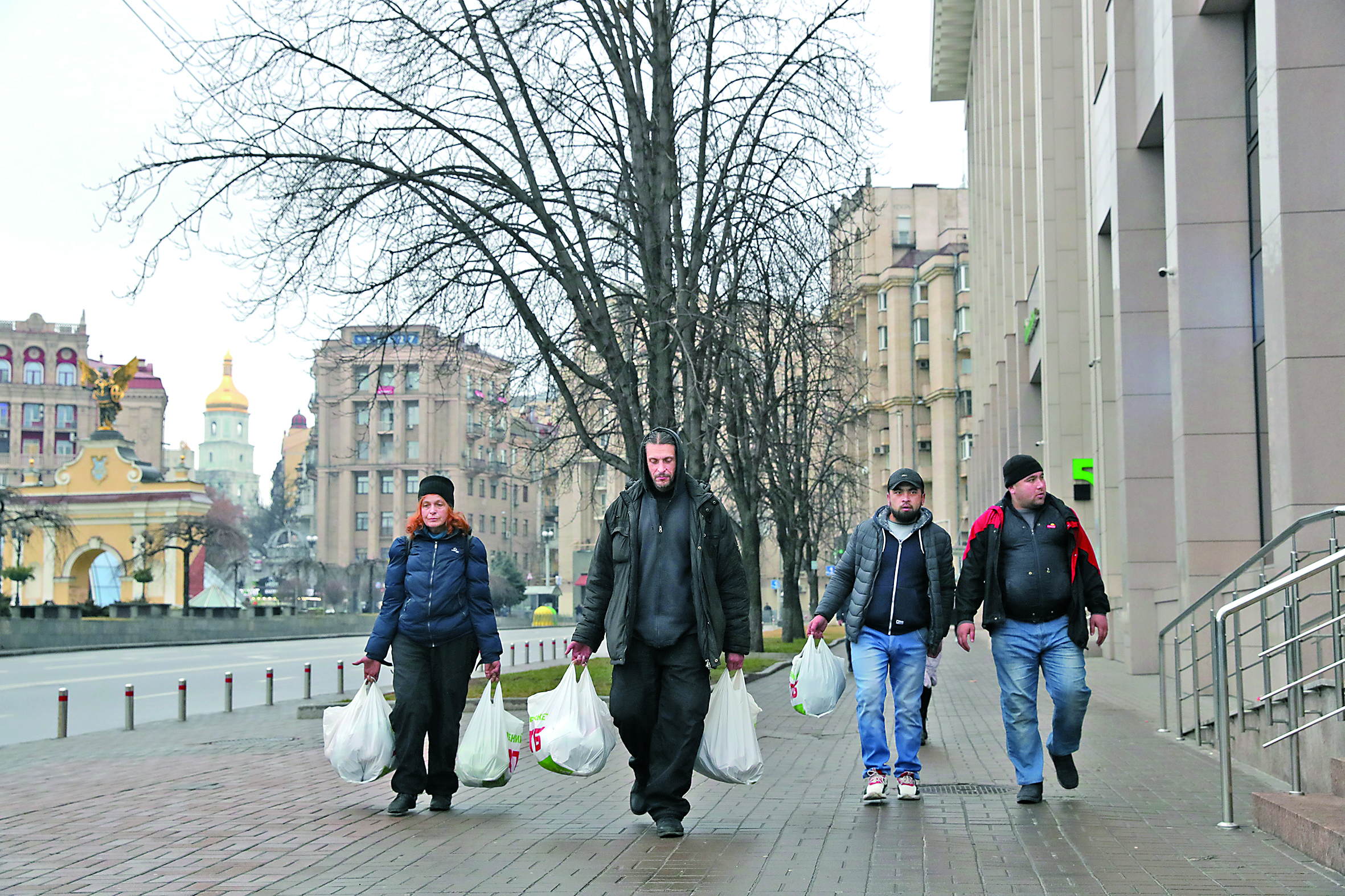 ▲2月24日,在乌克兰基辅,当地居民拎着采购的物资走在街道上。