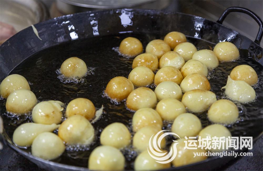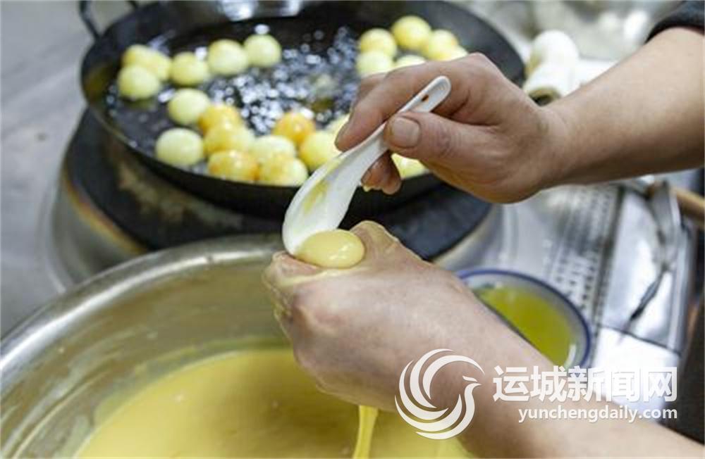 据介绍,做风葫芦时,首先要用热油和开水烫面,然后用擀面杖将面粉搅成光滑的团状;再分次打入鸡蛋,顺着一个方向搅拌均匀后,用勺子挖出一个个“面球”放入六成热的油锅中。