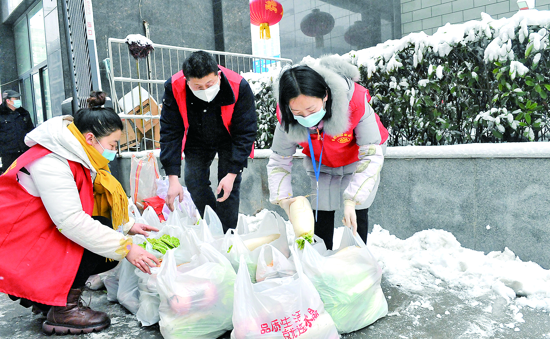 1月22日,在河南省安阳市建安社区一小区门口,社区工作人员在打包配送物资,准备为部分老人、居家隔离人员、行动不便人员等送货上门。新华社记者 韩朝阳 摄