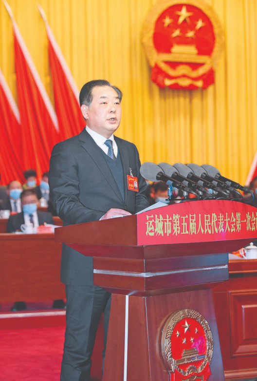 二月二十二日,在运城市第五届人民代表大会第一次会议上,邓雁平作市人大常委会工作报告。 记者 闫 鑫 摄