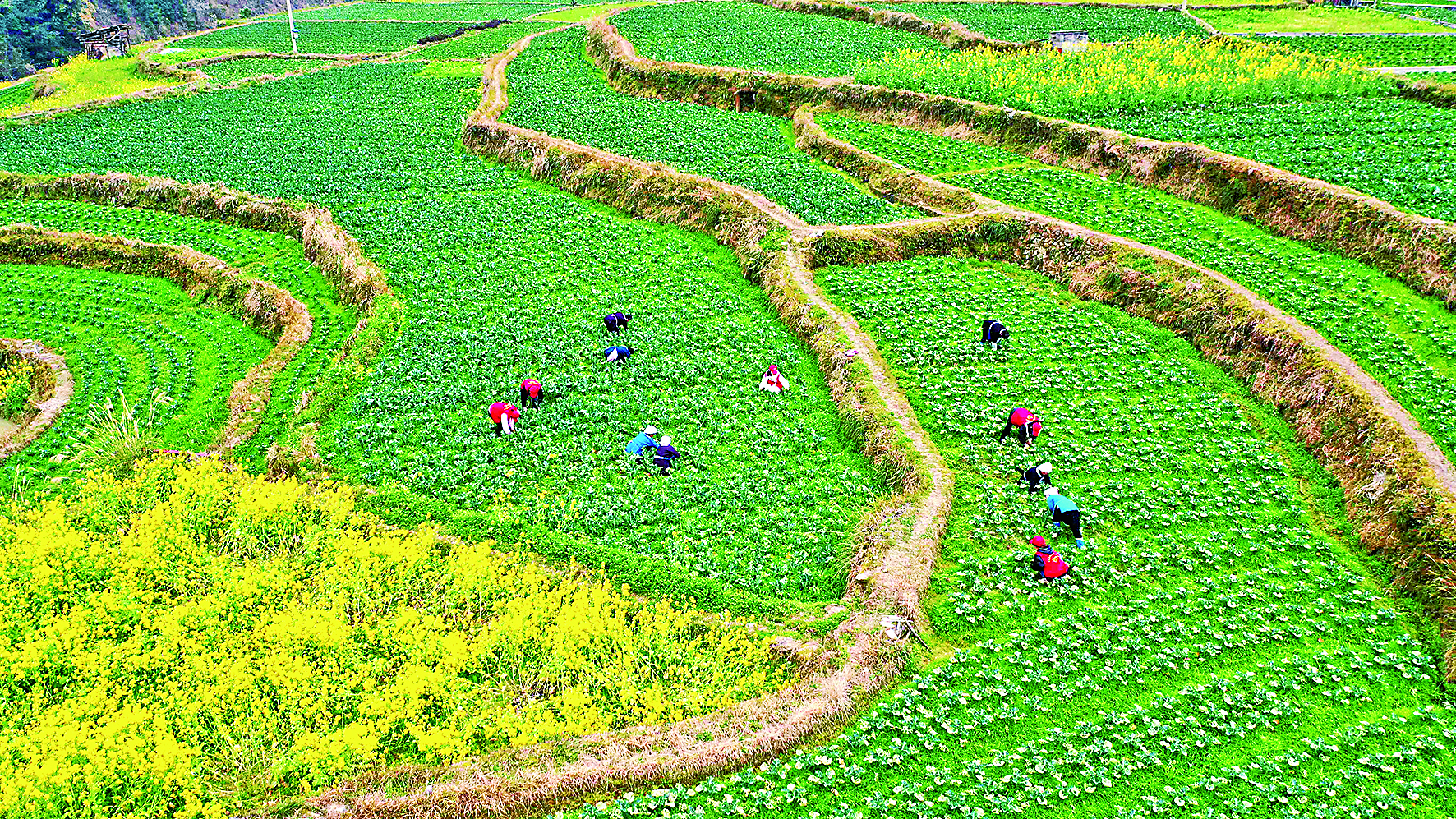 3月2日,村民和党员志愿者在贵州省黔东南苗族侗族自治州榕江县平永镇平寨村蔬菜基地除草。天气转暖,各地农民抢抓农时开展春耕生产,田间地头一派农忙景象。 新华社发(李长华 摄)