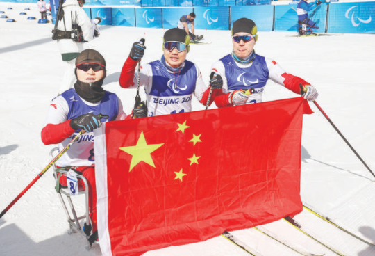 3月6日,中国选手郑鹏(中)、毛忠武(右)和杜天在比赛后。当日,北京2022年冬残奥越野滑雪——男子长距离(坐姿)比赛在国家冬季两项中心举行。最终中国选手郑鹏夺得金牌,毛忠武获得银牌,杜天获得第四名。新华社记者 兰红光 摄