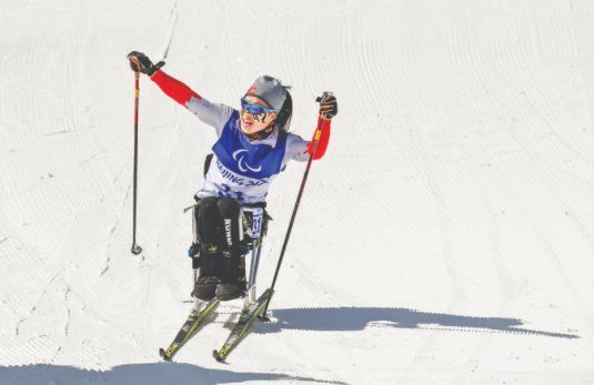 3月6日,中国选手杨洪琼在赛后庆祝。当日,北京2022年冬残奥会残奥越野滑雪女子长距离(坐姿)比赛在国家冬季两项中心举行。最终,中国选手杨洪琼夺得金牌。 新华社记者 李博 摄