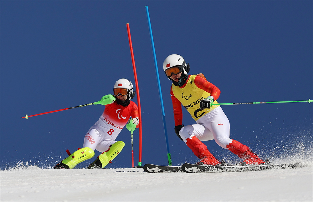 ▲3月7日,中国选手朱大庆(左)和引导员闫寒寒在比赛中。朱大庆最终获得亚军。 新华社记者 雒圆 摄