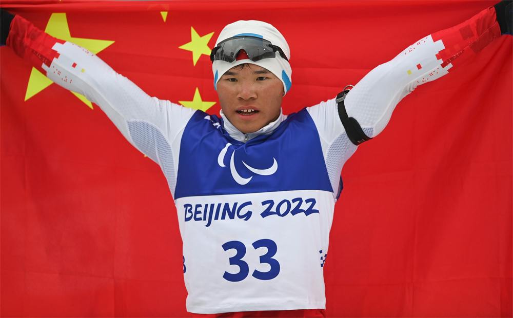 3月11日,中国选手刘梦涛在比赛后庆祝。他最终获得冠军。当日,北京2022年冬残奥会残奥冬季两项男子长距离(坐姿)比赛在河北张家口国家冬季两项中心举行。
