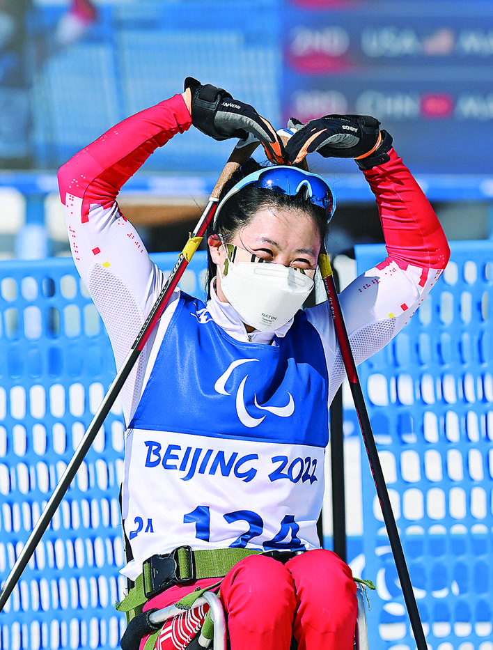 3月12日,中国选手杨洪琼在比赛后向观众比心。当日,北京2022年冬残奥会残奥越野滑雪女子中距离(坐姿)决赛在河北张家口国家冬季两项中心举行,杨洪琼获得冠军。