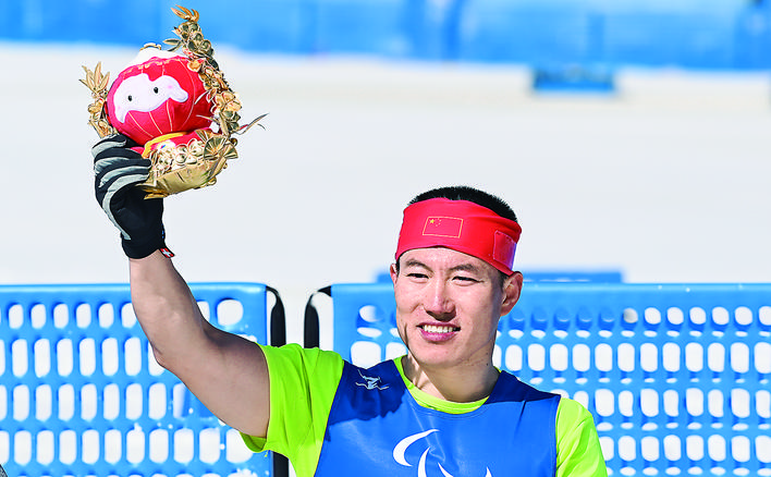 3月12日,中国选手毛忠武在比赛后庆祝。当日,毛忠武在北京2022年冬残奥会残奥越野滑雪男子中距离(坐姿)决赛中夺得冠军。 新华社记者 杨冠宇 摄