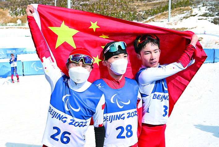 3月12日,冠军中国选手王晨阳(中)和获得季军的队友蔡佳云(左)以及获得第四名的刘晓彬在比赛后举起国旗。当日,北京2022年冬残奥会残奥越野滑雪男子中距离自由技术(站姿)决赛在河北张家口国家冬季两项中心举行。 新华社记者 杨冠宇 摄