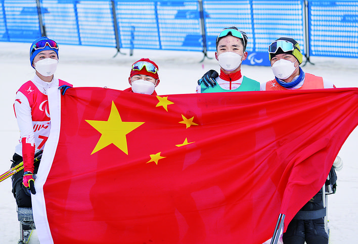 3月13日,中国队选手单怡霖、蔡佳云、王晨阳和郑鹏(从左至右)在完成比赛后合影。当日,北京2022年冬残奥会残奥越野滑雪混合接力4×2.5公里决赛在河北张家口国家冬季两项中心举行,最终中国队获得亚军。这是中国队在该项目获得的历史最好成绩。新华社记者 牟宇 摄