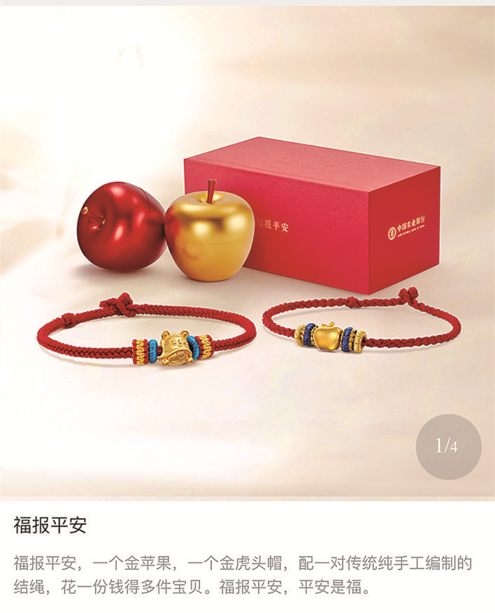 今年,中国农业银行推出了一系列虎年贵金属产品,有我国当代艺术家韩美林先生手书的“传世之宝”金银条;有紧扣生肖虎主题的“风生水起”“虎首金银章”系列;还有萌趣十足的“我是大王套装”和“福气东来”足银小萌虎等,可满足市民自用、送礼、收藏等不同需求。