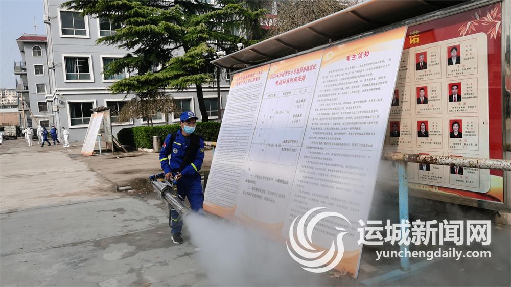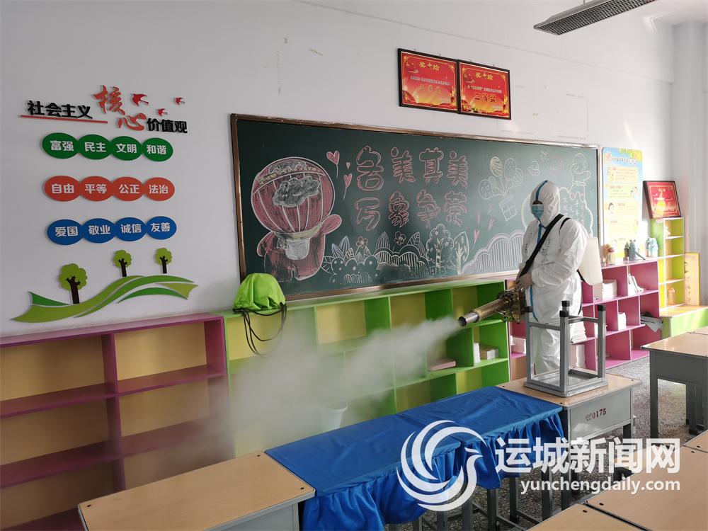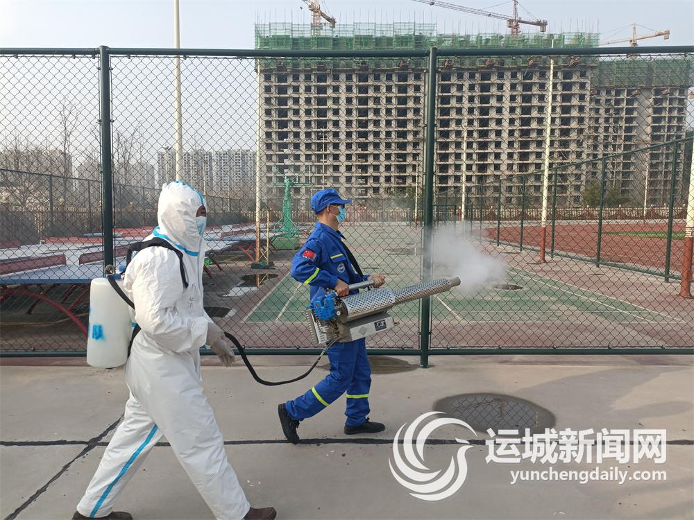 为进一步做好校园疫情防控工作,切实保障师生生命安全和身体健康,3月12日下午,万荣县蓝天救援队队员义务对万荣中学、示范小学两所学校进行全方位、无死角消杀,阻断疫情传染途径,为全校师生构筑安全屏障。图为万荣县蓝天救援队队员正在校园进行消杀。