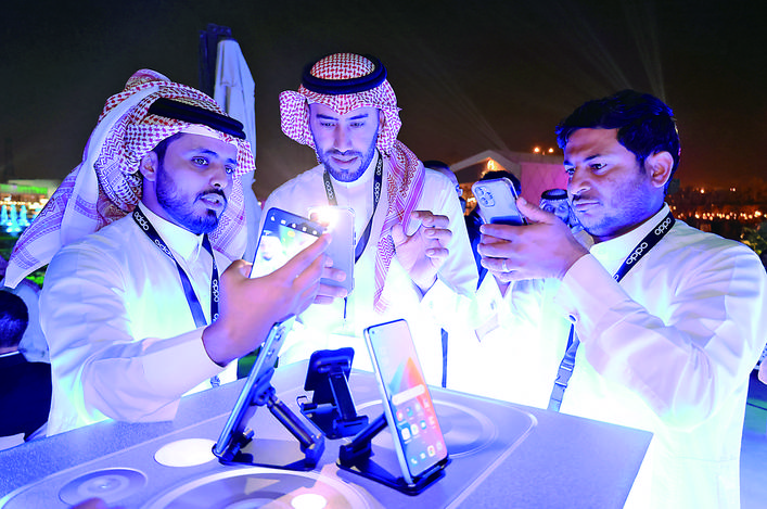 3月13日,在沙特阿拉伯首都利雅得,人们在OPPO新品发布会的活动场地内体验新产品。 中国智能手机制造商OPPO于13日在沙特阿拉伯首都利雅得举办产品发布会,在中东地区首次发布全新“Reno7”系列5G手机。 新华社记者 王海洲 摄