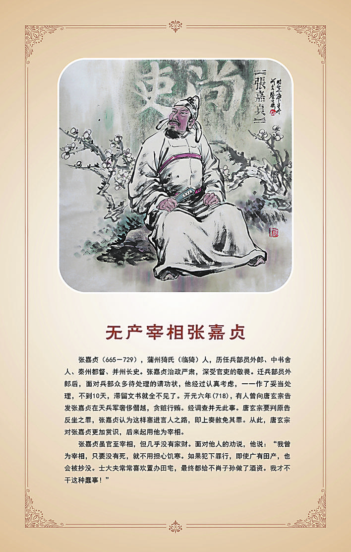 身居高位,最怕的就是迷失自我。张嘉贞的可贵之处就是始终保持了清明的态度,虽然官至宰相,但从不注重经营田园家宅。面对他人的劝说,他答道:“我当宰相,只要没有死,就不用担心饥寒。如果犯下罪行,即使广有田产,也会被抄没。士大夫常常喜欢置办田宅,最终都给不肖子孙做了酒色之资。我才不干这种蠢事!”他的见解和做法使闻者无不叹服,直到他去世的十余年之后,他的儿子张延赏仍然是平民百姓。