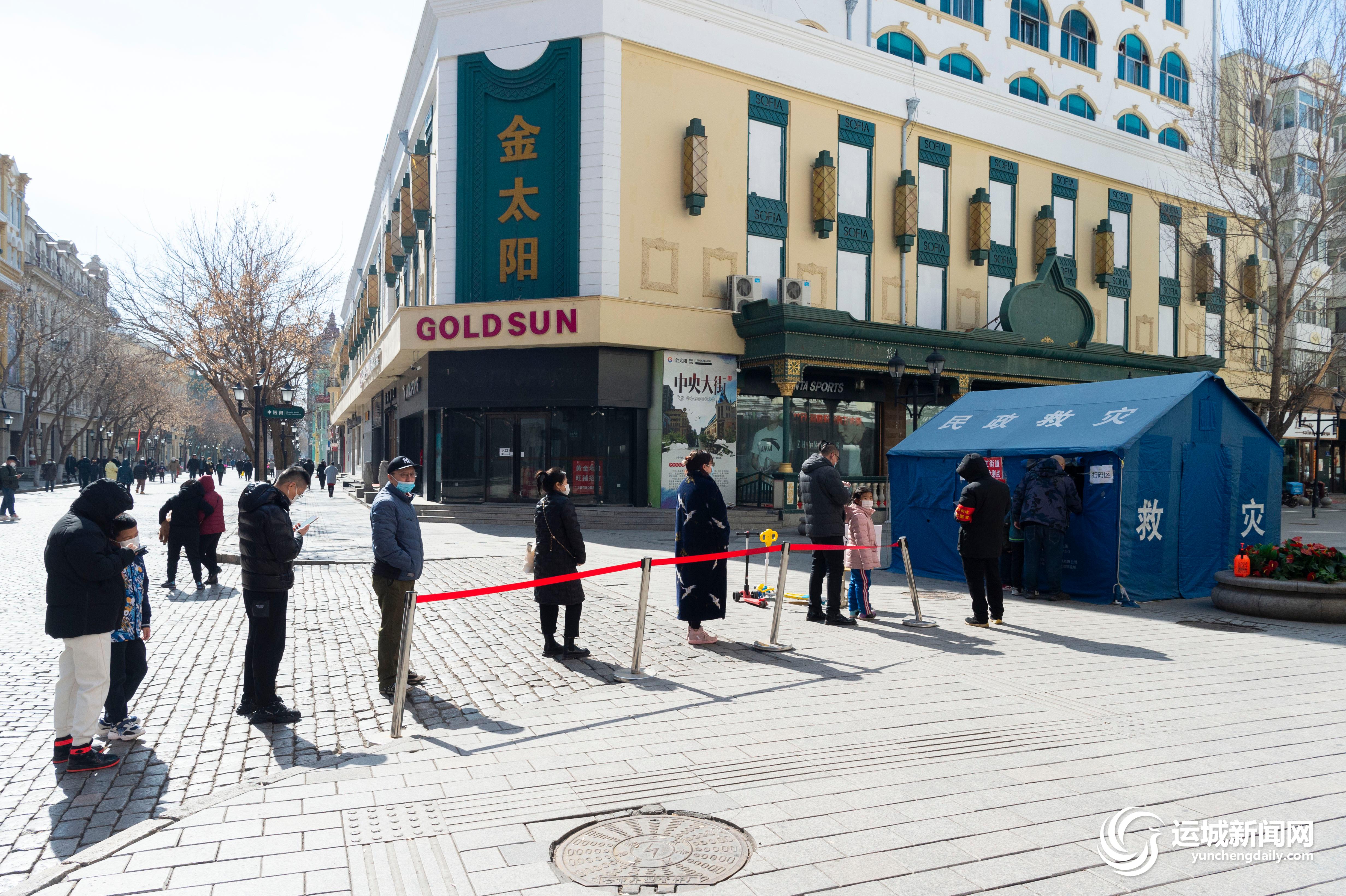 3月20日,在哈尔滨市道里区一处核酸检测采样点,市民排队等待核酸采样。