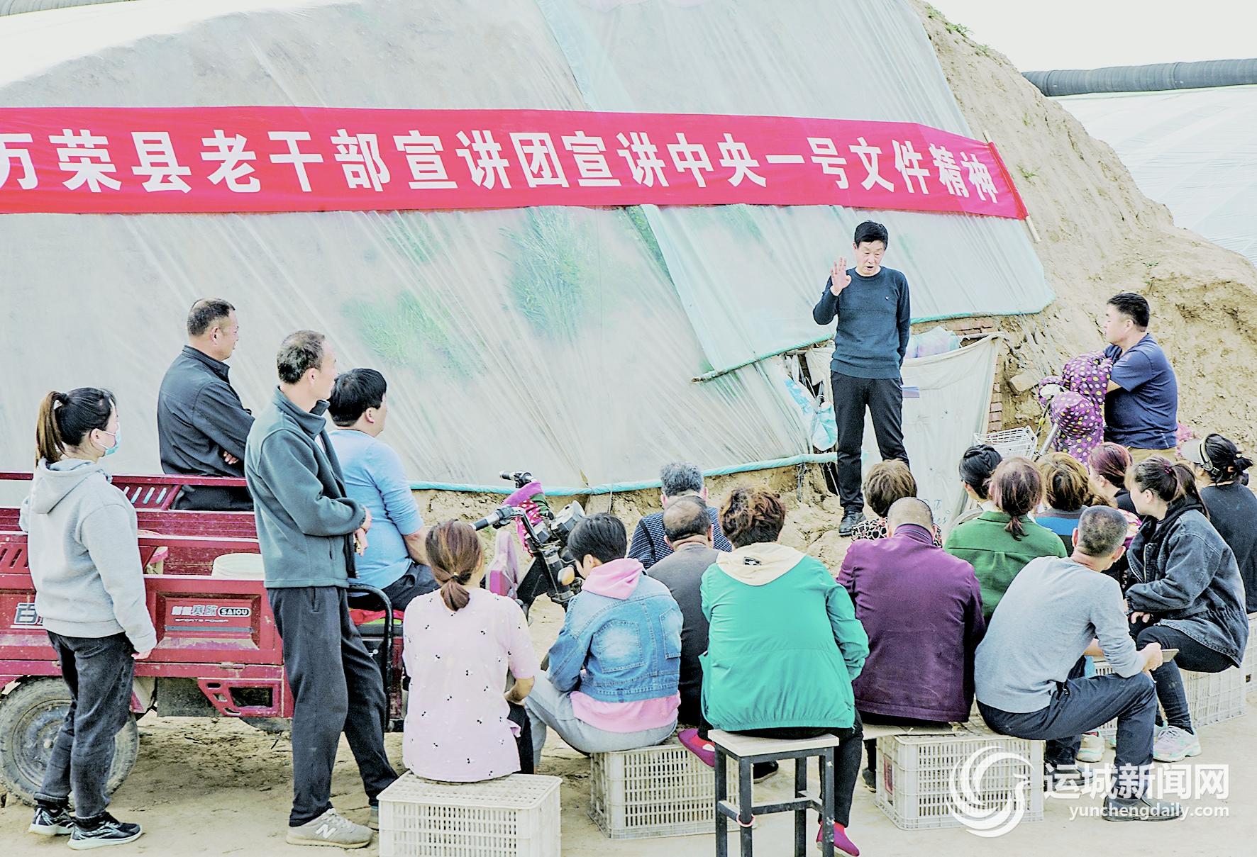 3月20日,春分到来之际,在万荣县东毋庄村设施大棚园区,一位曾多年主管“三农”工作的退休干部向农民宣讲中央一号文件精神。