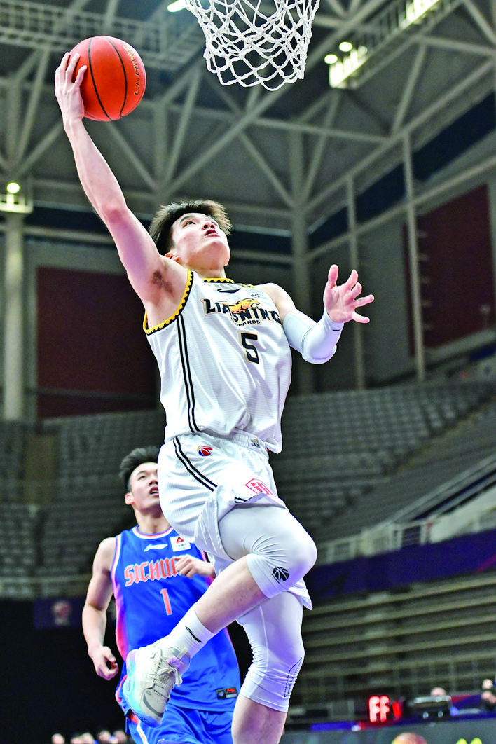 3月22日,辽宁本钢队球员周俊成(上)在比赛中上篮。 当日,在辽宁沈阳进行的2021-2022赛季中国男子篮球职业联赛(CBA)第三阶段第38轮比赛中,辽宁本钢队以134比90战胜四川金荣实业队。新华社记者 王乙杰 摄